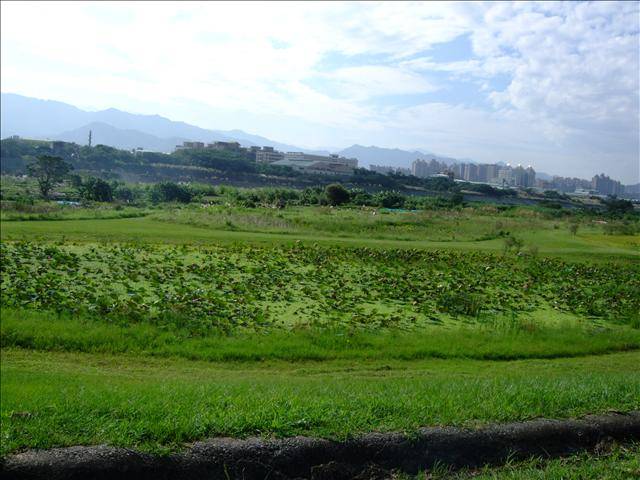『柑園橋』下左邊有濕地保護區,目前還有荷花盛開,右邊是片大草坪!